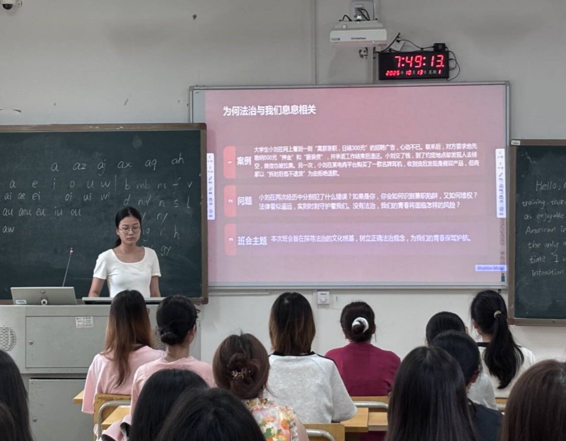 班会以班级为单位,通过ppt演示、主题讲解、视频播放和交流互动等形式展开。首先,由主持人引入班会主要内容,通过分享具体案例、提出相关问题等方式,以案释法,与同学们共同探寻法治的文化根基,增进了同学们对法治的认识,强调了法治与生活息息相关;随后,主持人对中华优秀传统法律文化和社会主义法治精神的核心进行介绍,追根溯源,增进了同学们对法治的精神与文化的理解;接着,对习近平总书记的法治指引进行阐释,对法治建设进行更深入的说明;最后,主持人发起倡议,号召同学们知行合一,争做校园法治卫士,将正确的法治观念内化于心、外化于行。